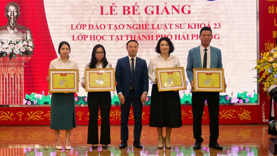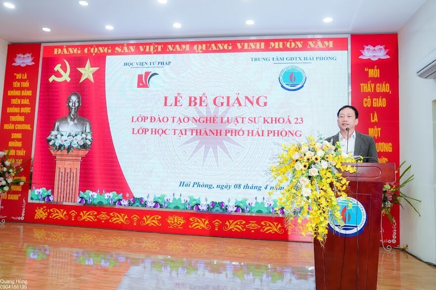 Sáng ngày 08/4/2023 được sự nhất trí của lãnh đạo Học viện Tư pháp, Trung tâm Giáo dục thường xuyên Hải Phòng, lễ bế giảng và trao giấy chứng nhân tốt nghiệp cho học viên lớp Đào tạo nghề Luật sư khóa 23 đã được tổ chức tại Trung tâm GDTX Hải Phòng. Buổi lễ có sự tham dự của Lãnh đạo Học viện Tư pháp, Lãnh đạo phòng chức năng Sở Giáo dục và Đào Hải Phòng và Trung tâm GDTX Hải Phòng cùng 48 học viên.