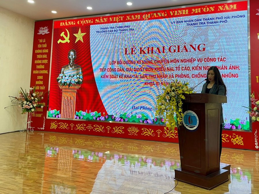 Phát biểu tại lễ khai giảng, thay mặt lãnh đạo Thanh tra thành phố, đồng chí Phạm Thị Nguyệt Ánh, Phó Chánh Thanh tra thành phố cảm ơn sự quan tâm của lãnh đạo UBND Thành phố; Thanh tra Chính phủ, các đơn vị, cục, vụ, đặc biệt là Trường Cán bộ Thanh tra đã phối hợp tổ chức các lớp đào tạo bồi dưỡng nghiệp vụ cho cán bộ trên địa bàn thành phố Hải Phòng.