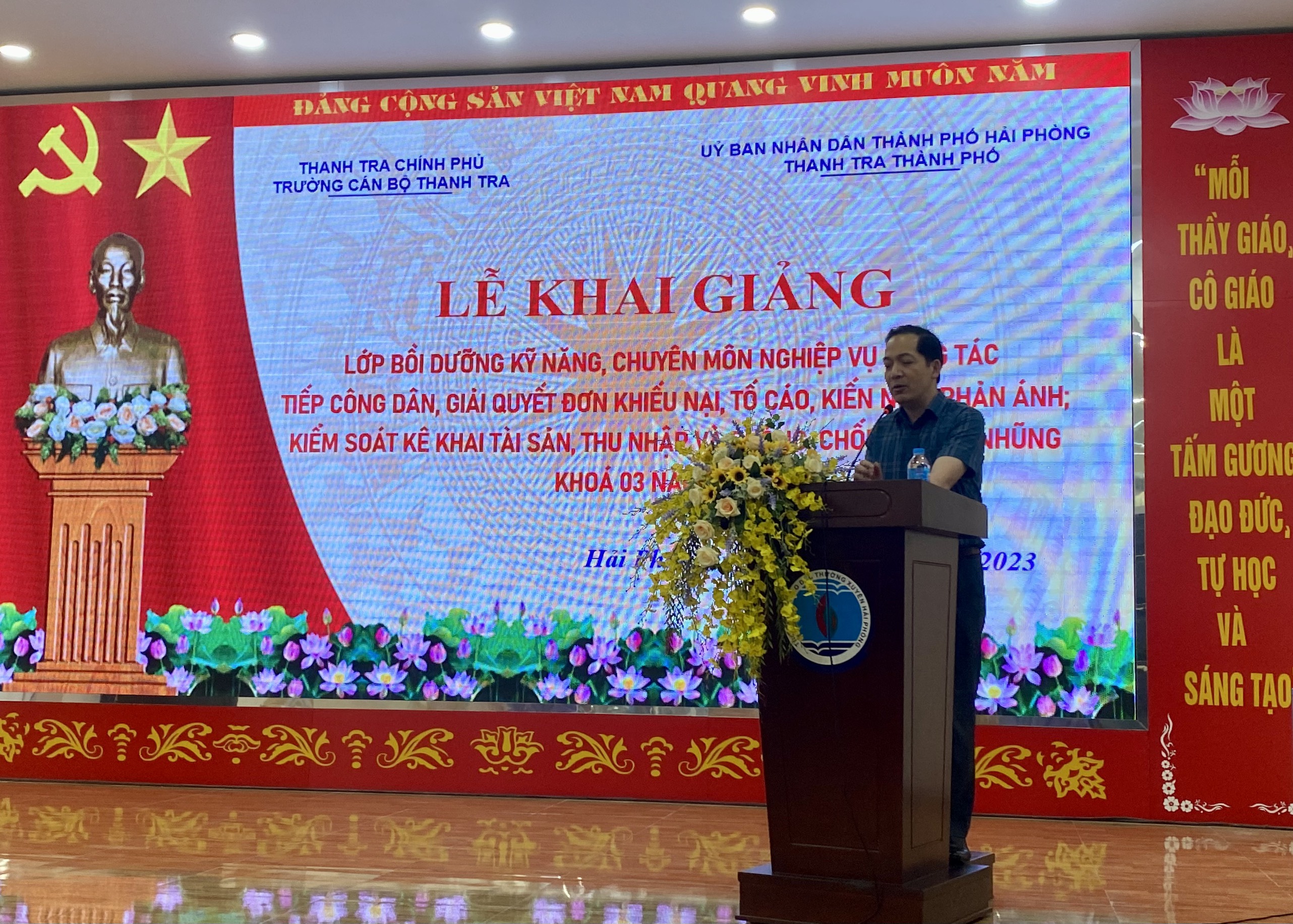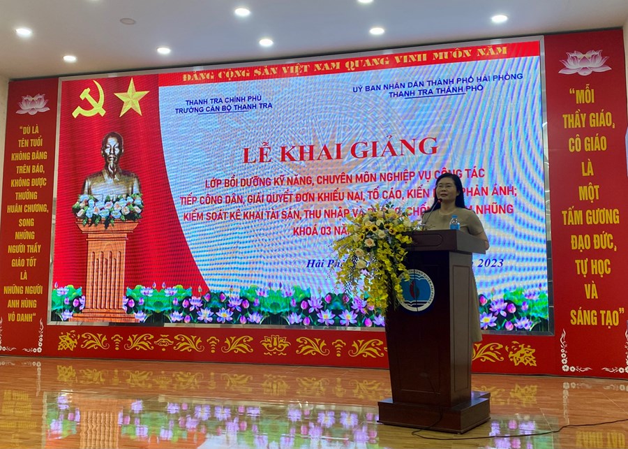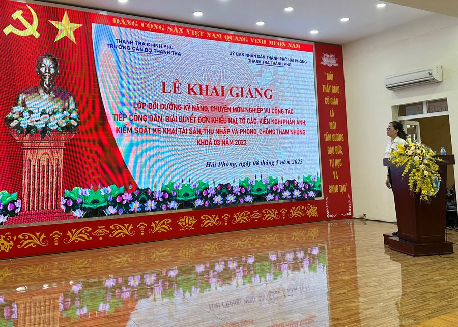 Thực hiện kế hoạch số 249/KH-UBND ngày 26/10/2022 của Uỷ ban nhân dân thành phố Hải Phòng về việc tổ chức các lớp tập huấn, bồi dưỡng kỹ năng, chuyên môn nghiệp vụ công tác tiếp công dân, giải quyết đơn khiếu nại, tố cáo, kiến nghị phản ánh; kiểm soát kê khai tài sản, thu nhập phòng, chống tham nhũng năm 2022. Nhằm xây dựng đội ngũ thanh tra vững vàng về chuyên môn nghiệp vụ, có đầy đủ kinh nghiệm, kỹ năng trong thực hiện nhiệm vụ, bám sát các quy định pháp luật của Thủ trưởng các cơ quan quản lý Nhà nước các cấp. Sáng 08/5/2023, Thanh tra thành phố phối hợp với Trường Cán bộ thanh tra và Trung tâm GDTX Hải Phòng tổ chức Lễ khai giảng các lớp Bồi dưỡng kỹ năng, chuyên môn nghiệp vụ công tác tiếp công dân, giải quyết đơn khiếu nại, tố cáo, kiến nghị phản ánh; kiểm soát kê khai tài sản, thu nhập phòng, chống tham nhũng Khoá 3 năm 2023 dành cho cán bộ tiếp công dân các địa phương, đơn vị, cán bộ tiếp công dân các xã, phường, thị trấn.