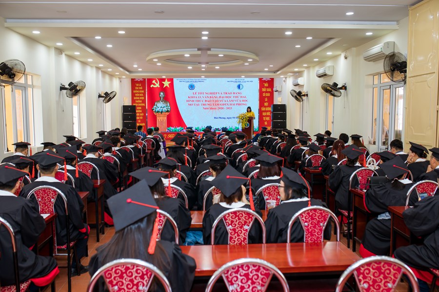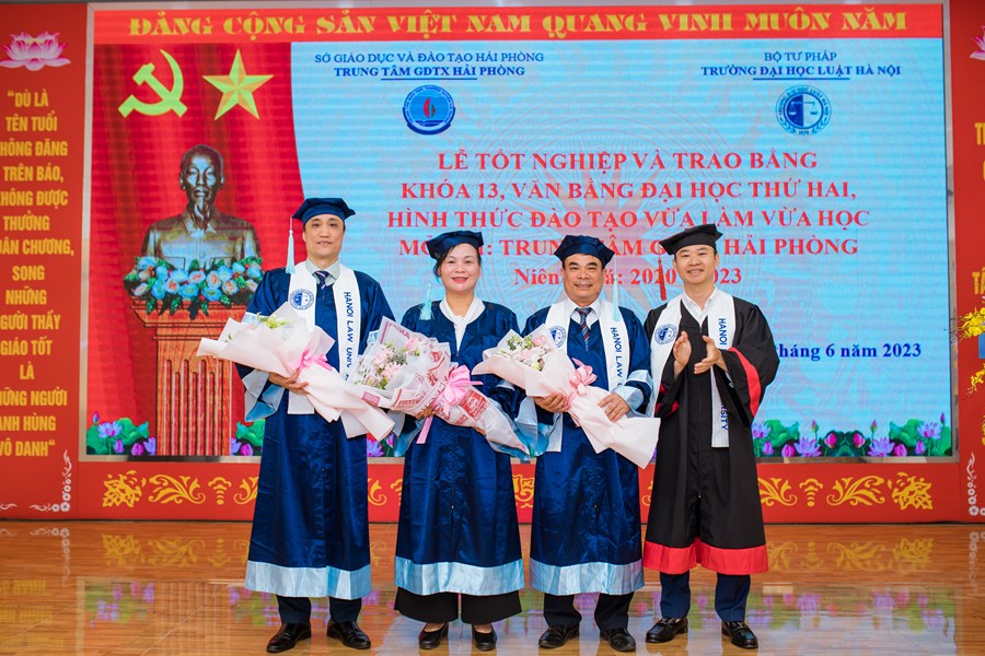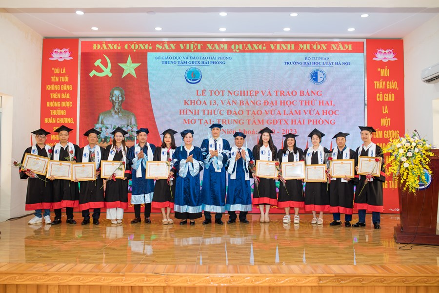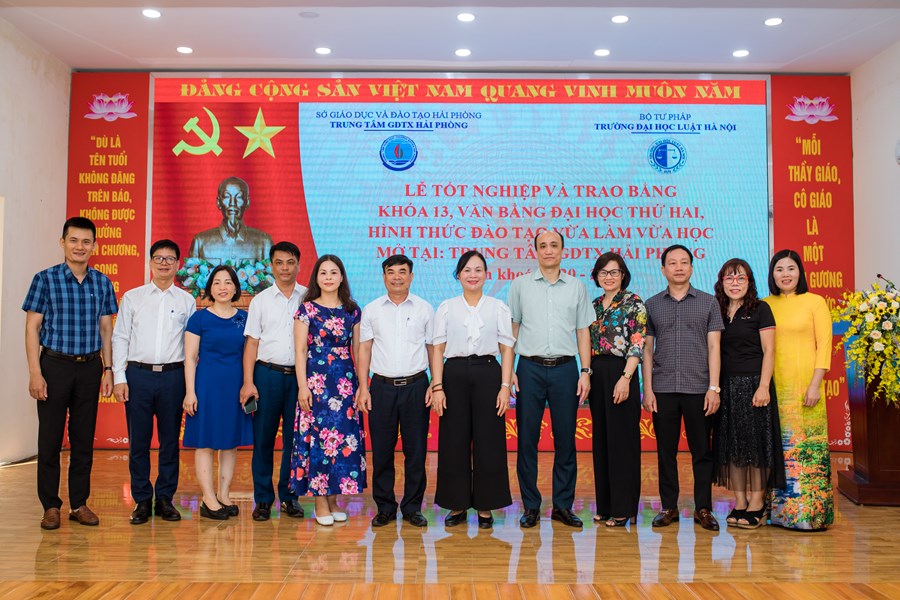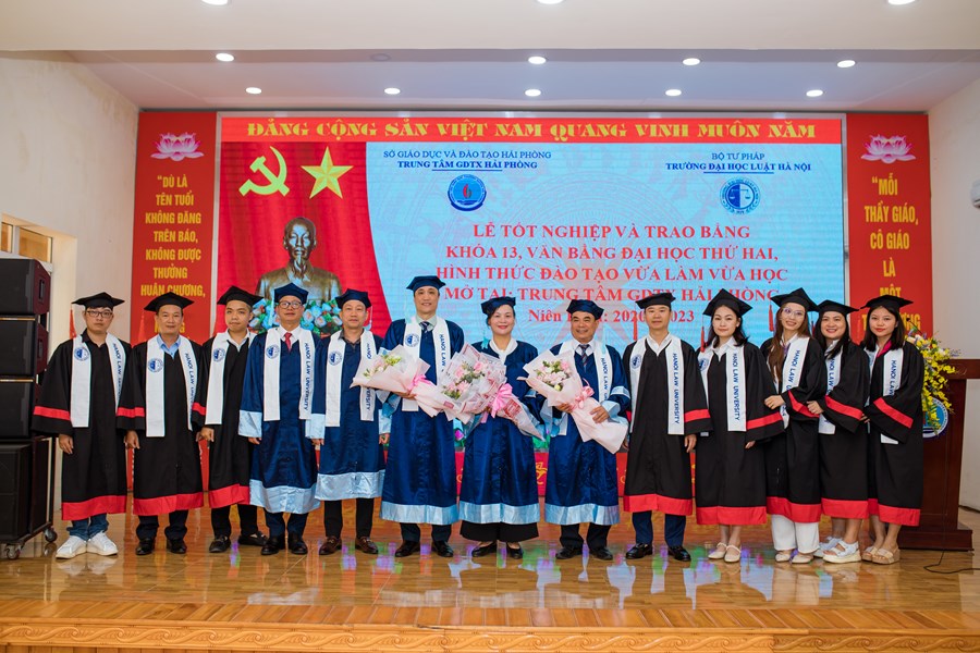 Lớp Đại học Luật văn bằng 2 khóa 13, Đại học Luật Hà Nội mở tại Trung tâm GDTX Hải Phòng khai giảng ngày 06/10/2020 gồm các học viên đến từ các Sở ban ngành, địa phương, doanh nghiệp trong thành phố Hải Phòng. Sau gần 3 năm học tập với không ít những khó khăn do đại dịch Covid-19 hay các nguyên nhân chủ quan khác, nhưng bằng sự quan tâm, tạo điều kiện của lãnh đạo hai nhà trường, sự cố gắng nỗ lực của đội ngũ cán sự lớp, mỗi cá nhân sinh viên, tập thể lớp Đại học Luật, văn bằng 2 hình thức vừa làm vừa học của Đại học Luật Hà Nội mở tại Trung tâm GDTX Hải Phòng đã về đích thành công. Ngày 28/04/2023, Trường Đại học Luật Hà Nội xét tốt nghiệp cho các sinh viên của lớp. Với kết quả 95/95 sinh viên đủ điều kiện tốt nghiệp, đạt tỉ lệ 100% là thành quả của các học viên và cũng là lòng mong mỏi, sự tin tưởng mà các thầy, cô giáo gửi gắm vào các cử nhân Luật.