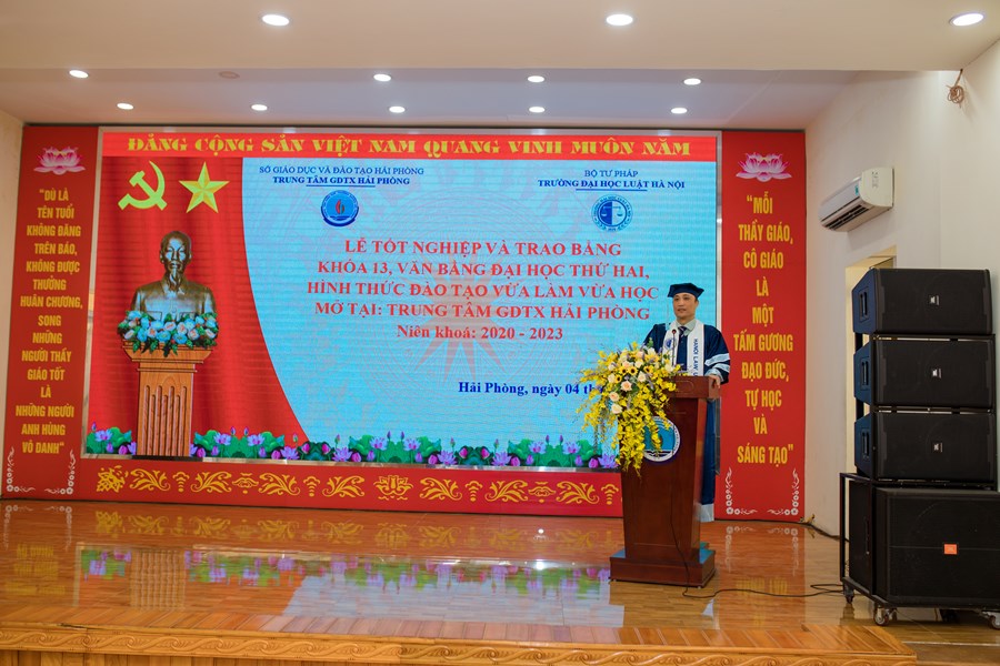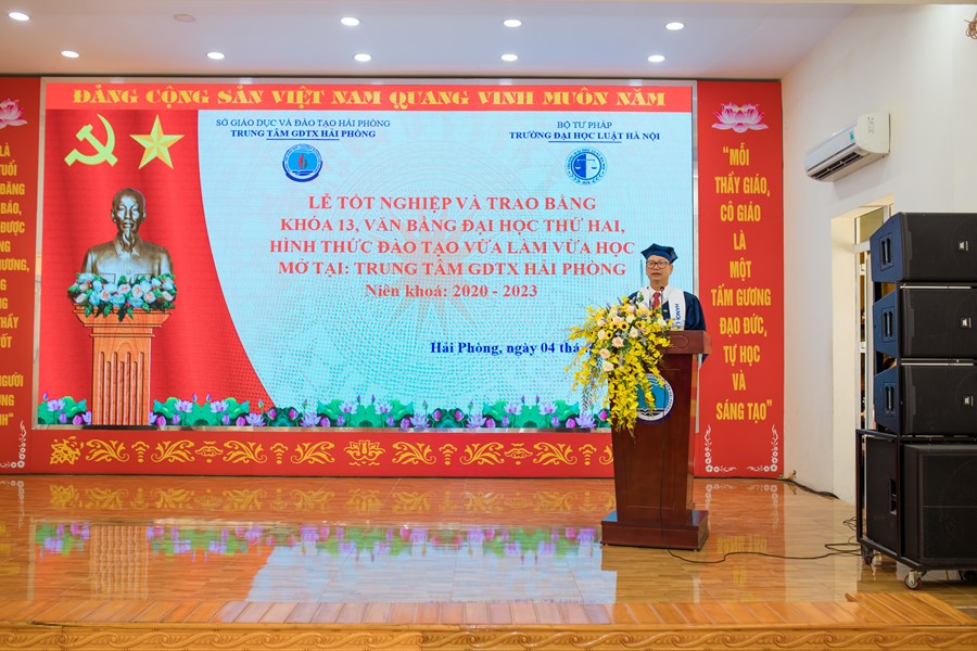 Phát biểu tại buổi lễ bế giảng PGS.TS Tô Văn Hòa – Phó hiệu trưởng, Trường Đại học Luật Hà Nội đã đánh giá cao công tác phối hợp trong công tác liên kết đào tạo giữa hai đơn vị là Trường Đại học Luật Hà Nội và Trung tâm GDTX Hải Phòng. Trong đó, Trung tâm GDTX Hải Phòng là đơn vị dẫn đầu trong cả nước về công tác tuyển sinh, số sinh viên tốt nghiệp hàng năm, là đơn vị tiêu biểu trong công tác liên kết đào tạo của Đại học Luật Hà Nội tại các địa phương. PGS.TS Tô Văn Hòa cũng ghi nhận biểu dương những thành tích trong học tập, rèn luyện của tập thể lớp và cá nhân từng học viên. Phó Hiệu trưởng mong muốn với những kiến thức đã tích lũy được trong gần 3 năm học tập được áp dụng vào thực tế, các cử nhân Luật sẽ tiếp tục phấn đấu thực hiện tốt nhiệm vụ được giao, đóng góp vào công cuộc cải cách ngành Tư pháp và hoàn thành nhiệm vụ chính trị của địa phương.