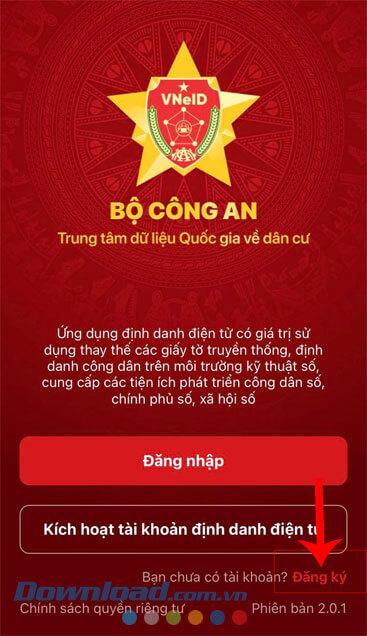 Bước 1: Đầu tiên, chúng ta sẽ mở ứng dụng VNeID trên điện thoại của mình lên. Tại giao diện đăng nhập của ứng dụng, nhấn vào nút Đăng ký.