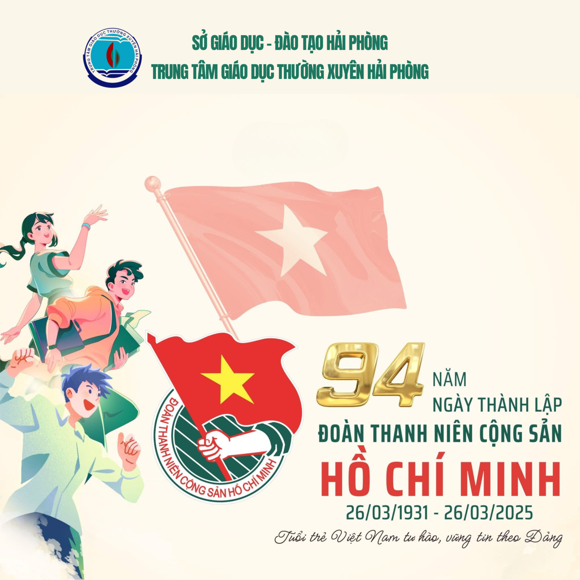 Nhân dịp kỷ niệm 94 năm ngày thành lập Đoàn TNCS Hồ Chí Minh (26/3/1931 - 26/3/2025), Tuổi trẻ Trung tâm Giáo dục thường xuyên Hải Phòng kính chúc các cán bộ Đoàn luôn tràn đầy sức khoẻ, giữ vững khát vọng cống hiến, tiếp tục cố gắng nỗ lực góp phần vào công cuộc xây dựng Tổ quốc và phát triển tổ chức Đoàn vững mạnh. Chúc Đoàn ta tuổi mới, thêm nhiều thành công và thắng lợi.