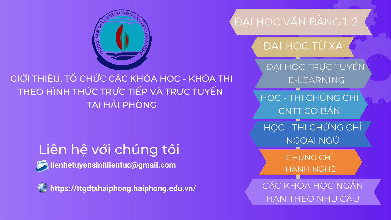 Bạn có nhu cầu học - thi các lớp ở các cấp độ, thuộc các lĩnh vực khác nhau theo hình thức trực tiếp hoặc trực tuyến tại Trung tâm Giáo dục thường xuyên Hải Phòng.