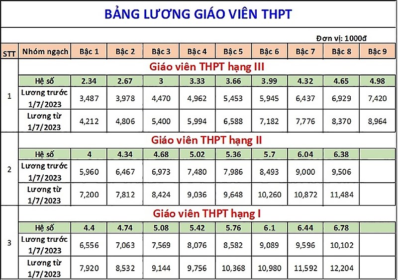 Chi tiết bảng lương của giáo viên khi tăng lương cơ sở từ 1/7/2023 như sau: