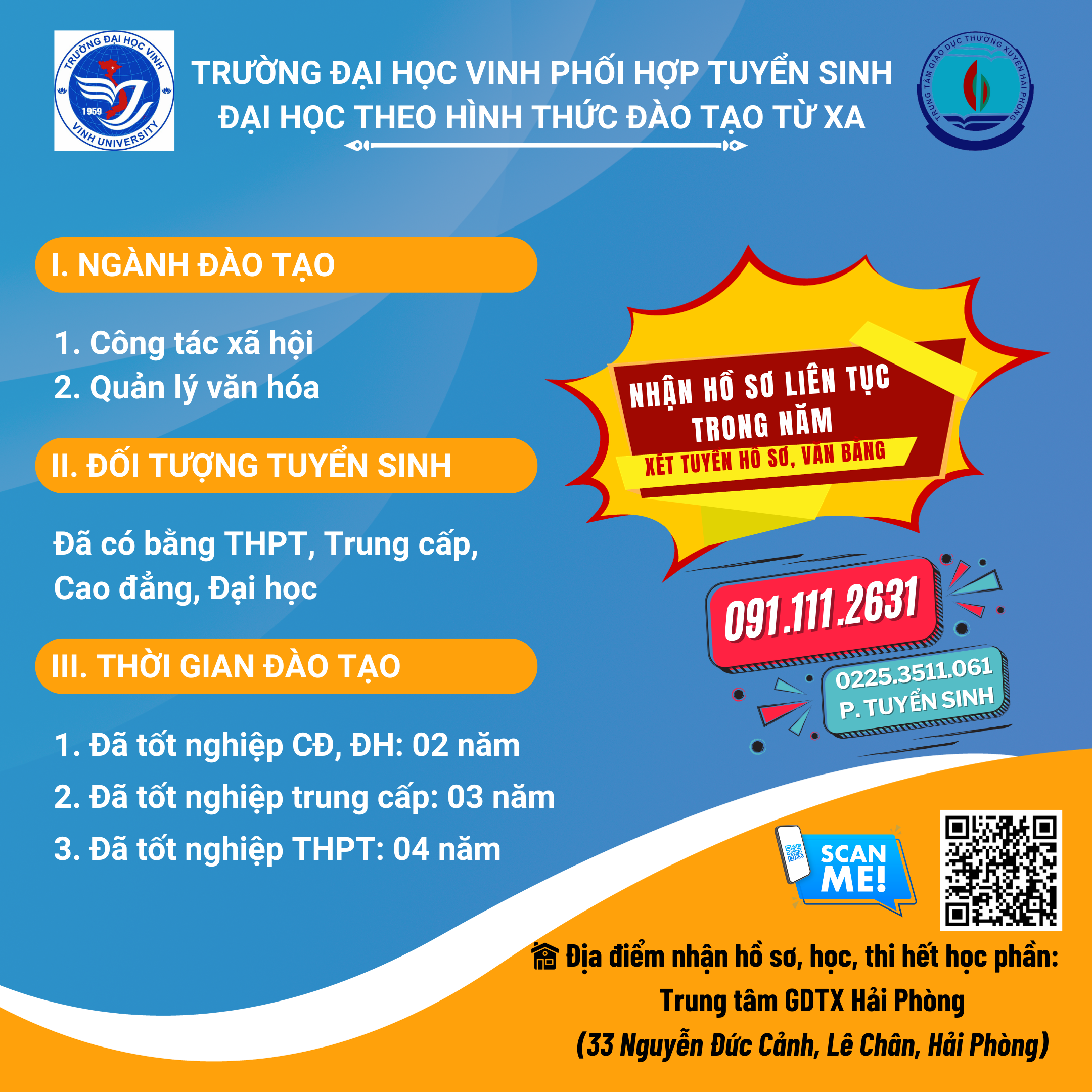 Trường Đại học Vinh phối hợp với Trung tâm Giáo dục Thường xuyên Hải Phòng tuyển sinh đào tạo và cấp bằng tốt nghiệp đại học theo hình thức đào tạo từ xa năm học 2023 - 2024 với các nội dung sau đây: