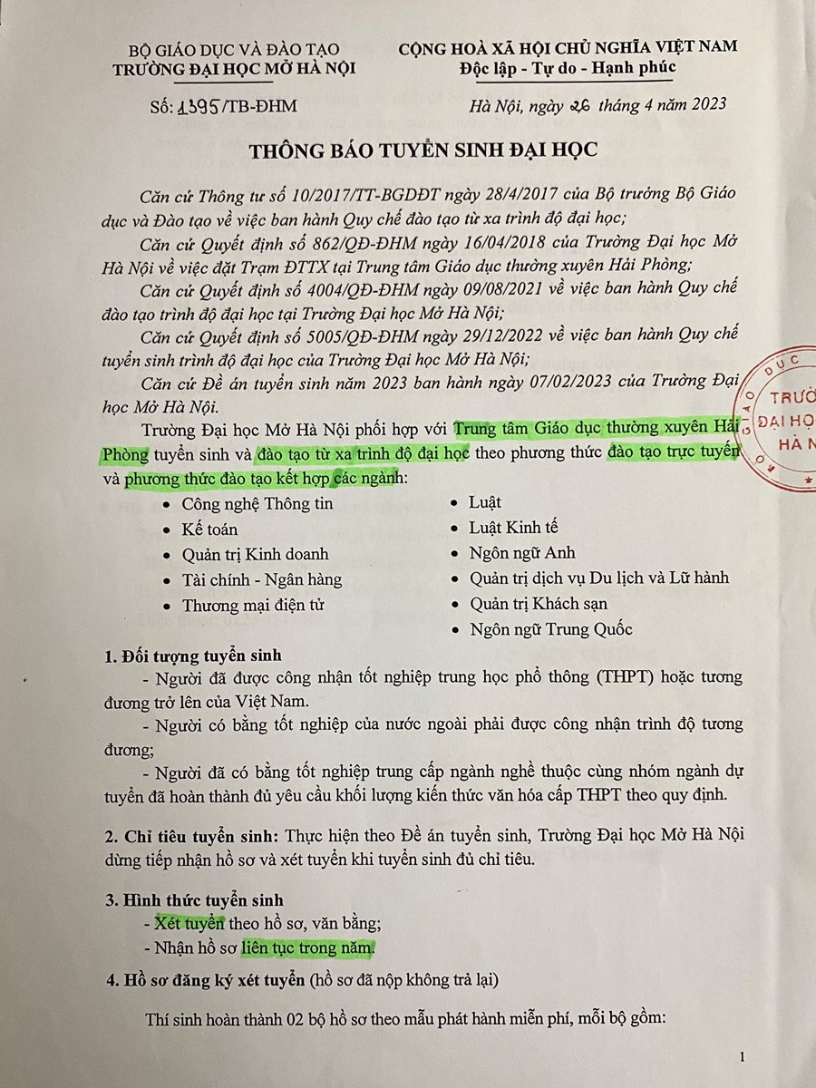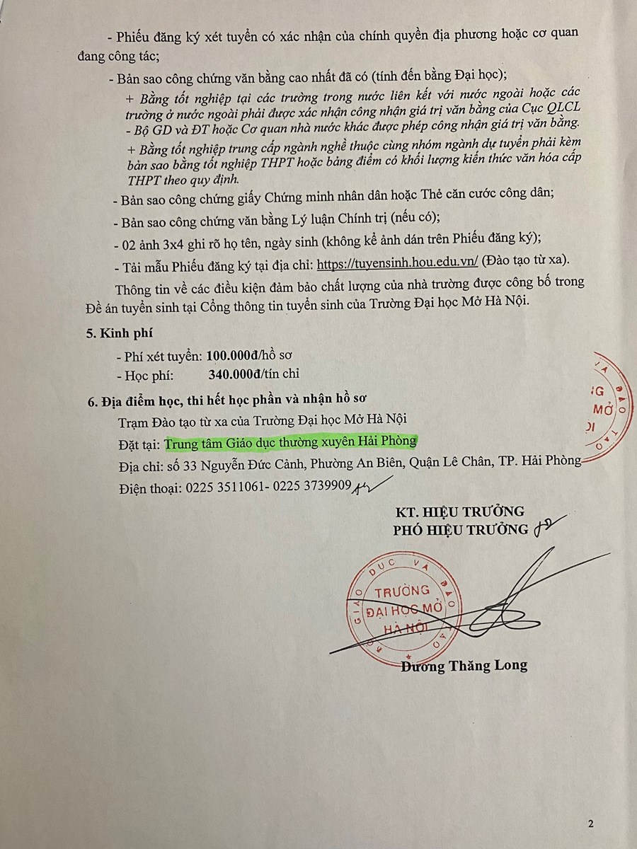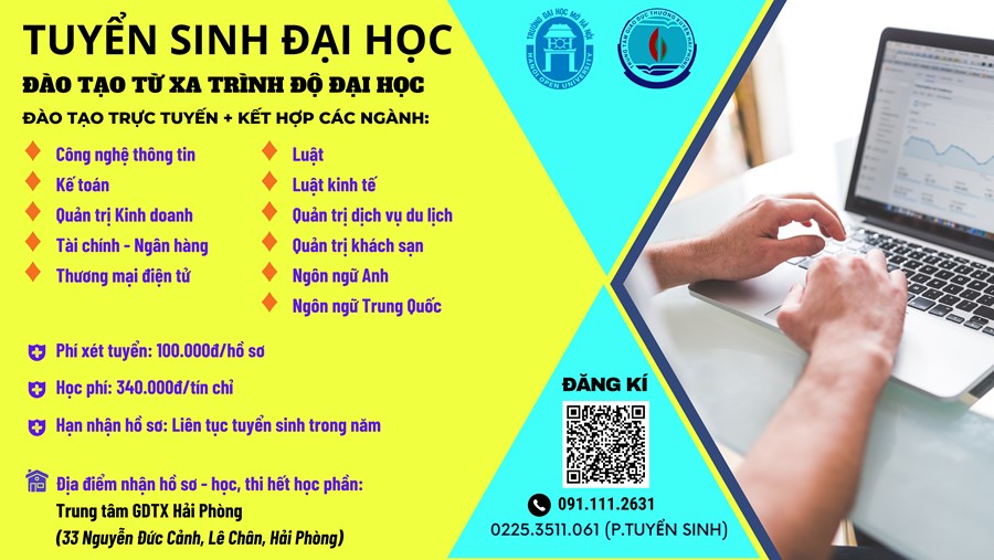 Trường Đại học Mở Hà Nội phối hợp với Trung tâm GDTX Hải Phòng tuyển sinh và đào tạo trình độ đại học theo phương thức đào tạo trực tuyến và đào tạo kết hợp.