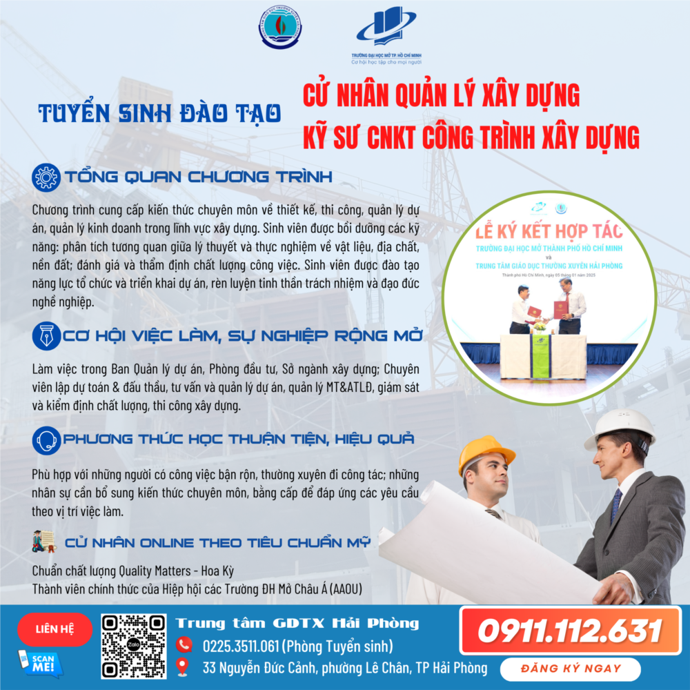 🎓 Chương trình Cử nhân trực tuyến ngành Quản lý xây dựng của Trường Đại học Mở Thành phố Hồ Chí Minh cung cấp kiến thức chuyên môn về thiết kế, thi công, quản lý dự án, quản lý kinh doanh trong lĩnh vực xây dựng. Sinh viên được bồi dưỡng các kỹ năng: phân tích tương quan giữa lý thuyết và thực nghiệm về vật liệu, địa chất, nền đất; đánh giá và thẩm định chất lượng công việc. Ngoài ra, sinh viên được đào tạo năng lực tổ chức và triển khai dự án, rèn luyện tinh thần trách nhiệm và đạo đức nghề nghiệp.